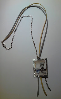 Το κόλλησα πάνω σε λίγο χοντρό χαρτί, άφησα γύρω γύρω ένα περιθώριο και αφού το έκοψα, το κόλλησα πάνω στο φύλλο αλουμινίου. Έκοψα περιμετρικά(αφήνοντας πάλι περιθώριο και δίπλωσα τις άκρες σαν να σχηματίζω κορνίζα. έκανα μια τρύπα με το εργαλείο για τις ζώνες, πέρασα ένα κρικάκι και επειδή δεν μπορούσα να διαλέξω αλυσίδα ή σουέτ κορδονάκι, έβαλα και τα δύο (μάλλον 3 γιατί ήμουν ανάμεσα σε 2 χρώματα κορδόνι!). Βουαλά!